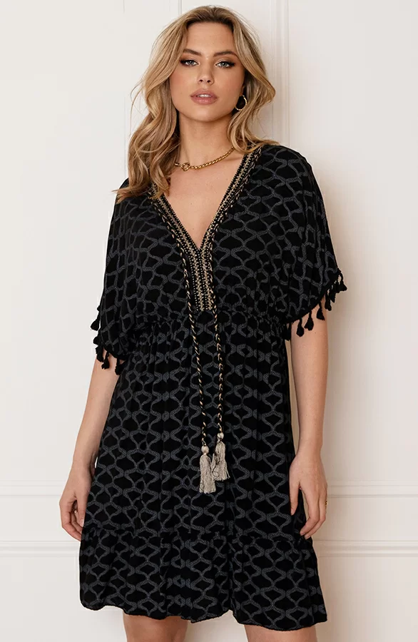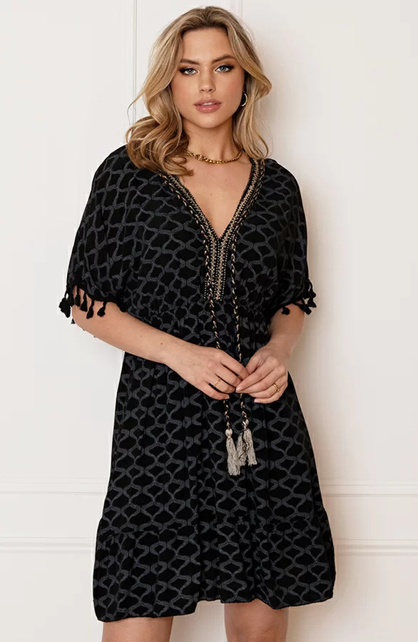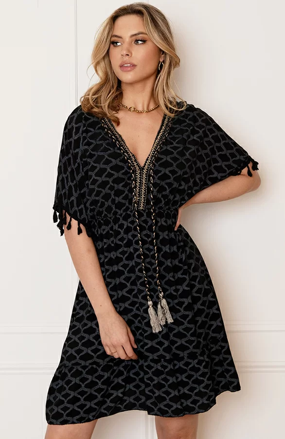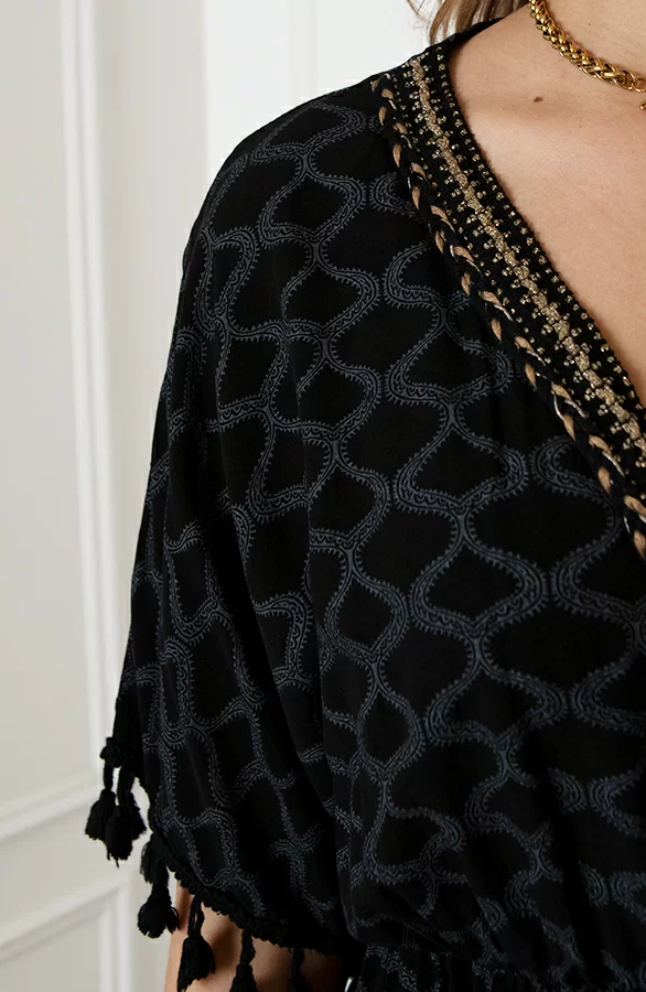 Details: v-hals, korte mouwen, elastiek in de taille, pompons, gevlochten touwtjes en lurex Materiaal: 100% Viscose