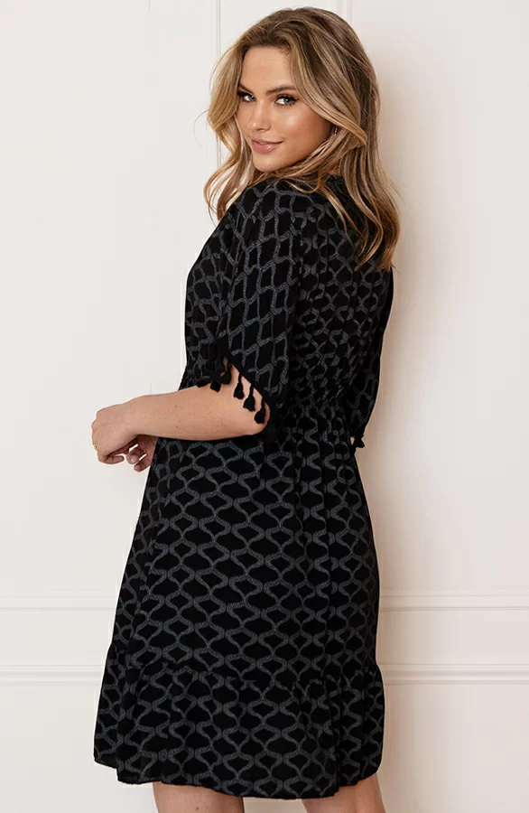 Loop er helemaal fashionable bij met deze super mooie jurk! De jurk is voorzien van korte mouwen en elastiek in de taille.