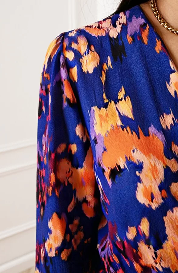 Details: v-hals, ruches, overslag, bijpassend ceintuur in de taille, elastiek in de taille en elastiek bij de mouwen Materiaal: 100% Polyester
