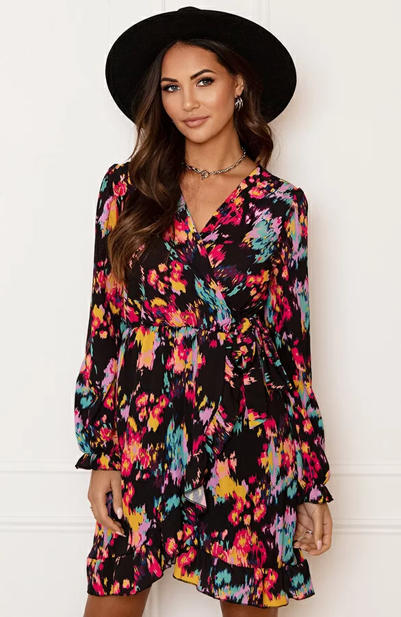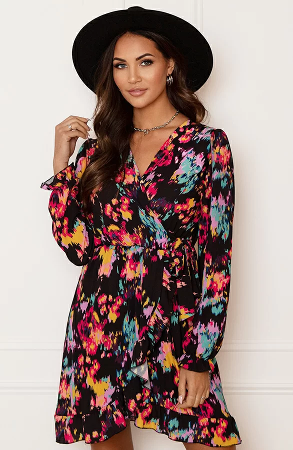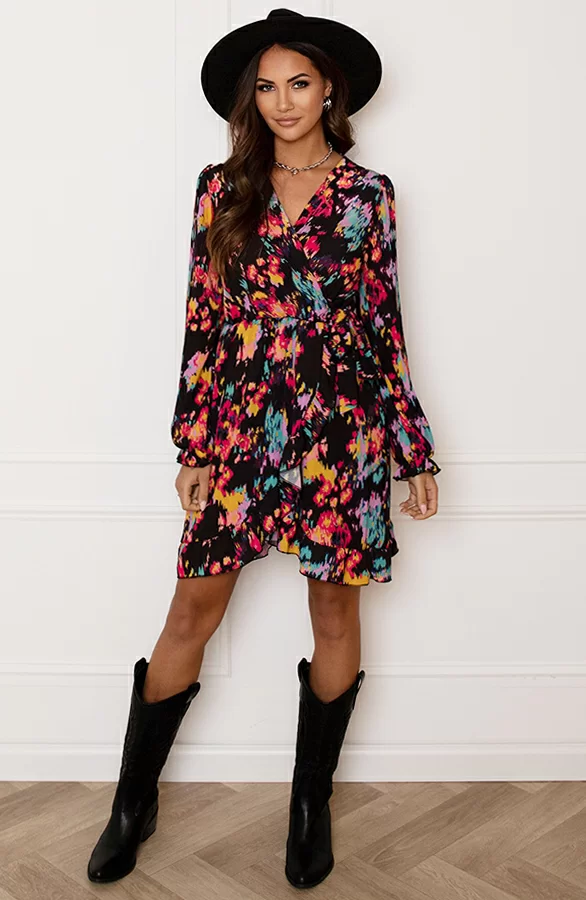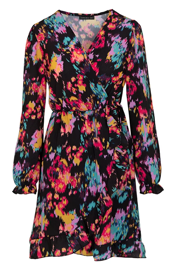 Details: v-hals, ruches, overslag, bijpassend ceintuur in de taille, elastiek in de taille en elastiek bij de mouwen