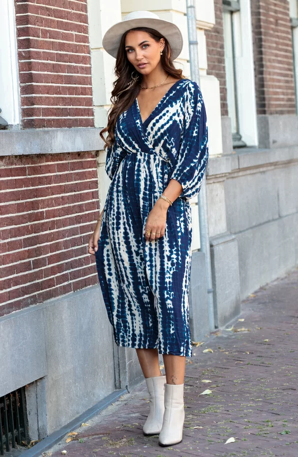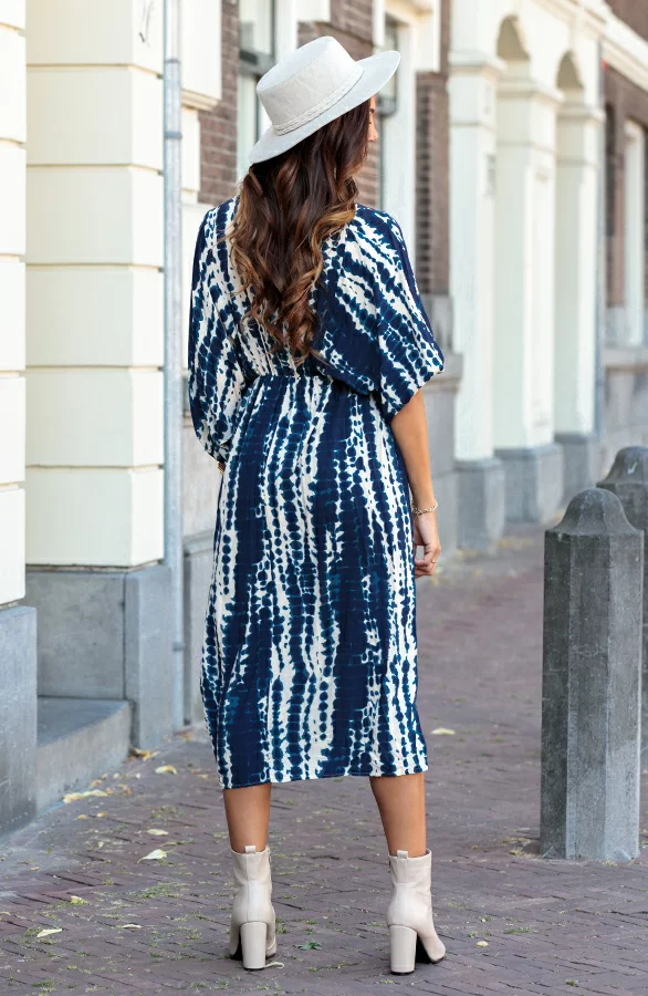 Oohlala! Deze fijne jurk mag niet ontbreken in jouw kledingkast! De midi jurk is voorzien van vleermuismouwen en elastiek in de taille.