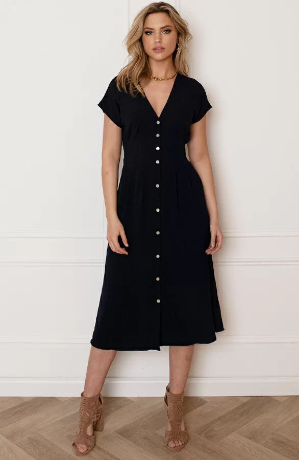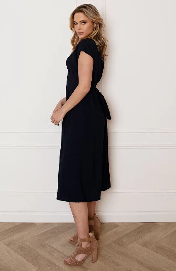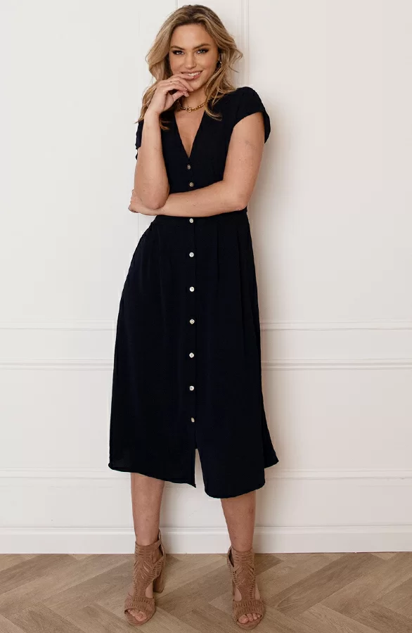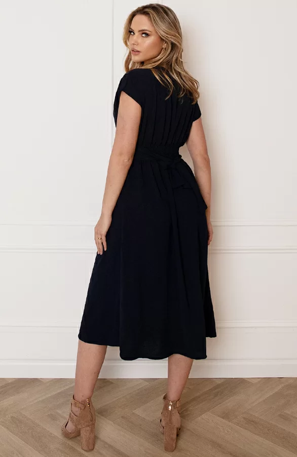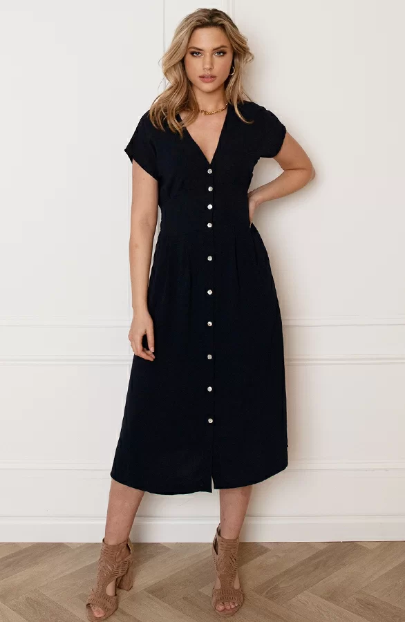 We love blue! Deze jurk is een echte eyecatcher! De jurk is voorzien van een knoopsluiting en een lint om te strikken.