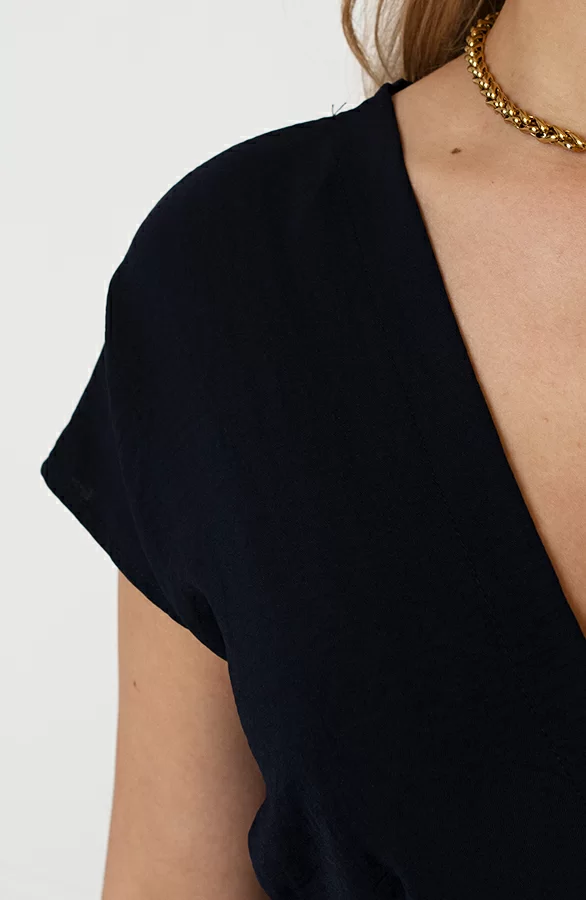 Details: v-hals, korte mouwen, lint om te strikken, knoopsluiting en elastiek Materialen: 5% Elastaan, 95% Polyester